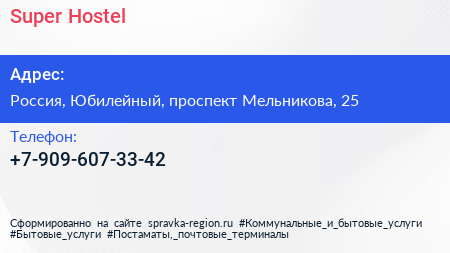 Super Hostel по адресу 25, проспект Мельникова, Родионово, микрорайон ИКЕА, Планерная, Химки, городской округ Химки, Московская область, Центральный федеральный округ, 141501, Россия в дальнейшем Организация, размещена в следующих категориях: