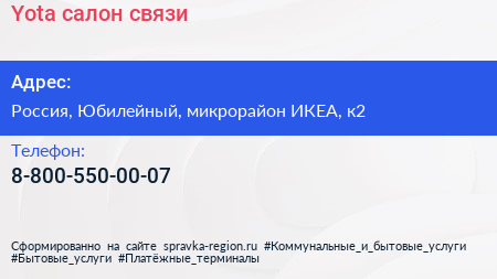 Yota, салон связи по адресу МЕГА Химки, 1, Ленинградское шоссе, Родионово, микрорайон ИКЕА, Химки, городской округ Химки, Московская область, Центральный федеральный округ, 141410, Россия в дальнейшем Организация, размещена в следующих категориях: