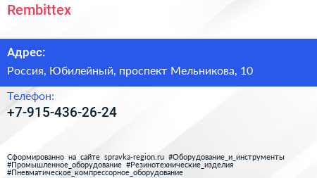 Rembittex по адресу Фармленд, 10, проспект Мельникова, Родионово, Новокуркино, Новые Химки, Химки, городской округ Химки, Московская область, Центральный федеральный округ, 141410, Россия в дальнейшем Организация, размещена в следующих категориях: