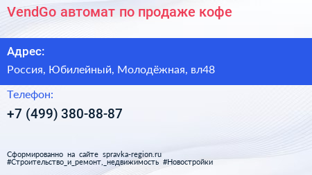 VendGo, автомат по продаже кофе по адресу Да!, вл48, Молодёжная улица, Родионово, Новокуркино, Новые Химки, Химки, городской округ Химки, Московская область, Центральный федеральный округ, 119296, Россия в дальнейшем Организация, размещена в следующих категориях: