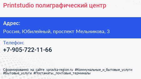 Printstudio, полиграфический центр по адресу 3, проспект Мельникова, Родионово, Новокуркино, Новые Химки, Химки, городской округ Химки, Московская область, Центральный федеральный округ, 141501, Россия в дальнейшем Организация, размещена в следующих категориях: