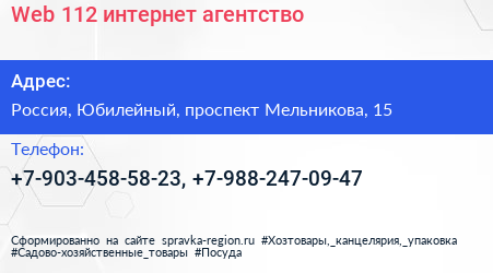 Web 112, интернет-агентство по адресу 15, проспект Мельникова, Родионово, микрорайон ИКЕА, Планерная, Химки, городской округ Химки, Московская область, Центральный федеральный округ, 141501, Россия в дальнейшем Организация, размещена в следующих категориях: