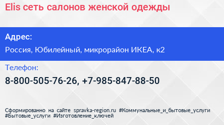 Elis, сеть салонов женской одежды по адресу МЕГА Химки, 1, Ленинградское шоссе, Родионово, микрорайон ИКЕА, Химки, городской округ Химки, Московская область, Центральный федеральный округ, 141410, Россия в дальнейшем Организация, размещена в следующих категориях: