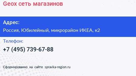 Geox, сеть магазинов по адресу МЕГА Химки, 1, Ленинградское шоссе, Родионово, микрорайон ИКЕА, Химки, городской округ Химки, Московская область, Центральный федеральный округ, 141410, Россия в дальнейшем Организация, размещена в следующих категориях: