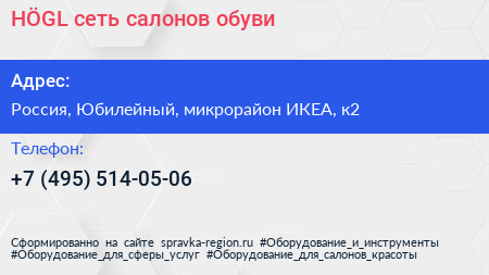 HÖGL, сеть салонов обуви по адресу МЕГА Химки, 1, Ленинградское шоссе, Родионово, микрорайон ИКЕА, Химки, городской округ Химки, Московская область, Центральный федеральный округ, 141410, Россия в дальнейшем Организация, размещена в следующих категориях: