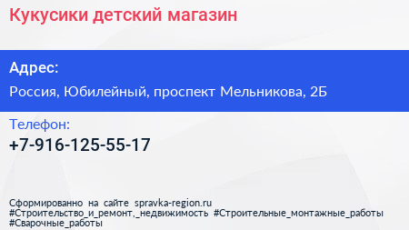 Кукусики, детский магазин по адресу Пятёрочка, 2Б, проспект Мельникова, Родионово, Новокуркино, Новые Химки, Химки, городской округ Химки, Московская область, Центральный федеральный округ, 141410, Россия в дальнейшем Организация, размещена в следующих категориях: