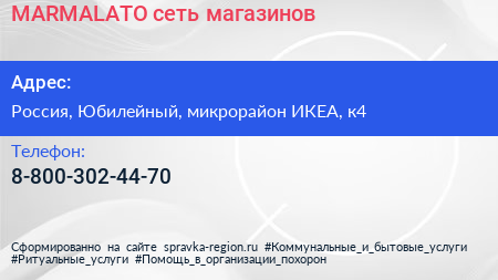 MARMALATO, сеть магазинов по адресу МЕГА Химки, 1, Ленинградское шоссе, Родионово, микрорайон ИКЕА, Химки, городской округ Химки, Московская область, Центральный федеральный округ, 141410, Россия в дальнейшем Организация, размещена в следующих категориях: