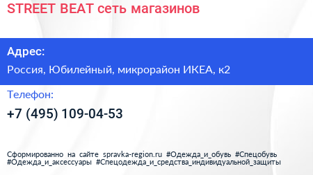 STREET BEAT, сеть магазинов по адресу МЕГА Химки, 1, Ленинградское шоссе, Родионово, микрорайон ИКЕА, Химки, городской округ Химки, Московская область, Центральный федеральный округ, 141410, Россия в дальнейшем Организация, размещена в следующих категориях: