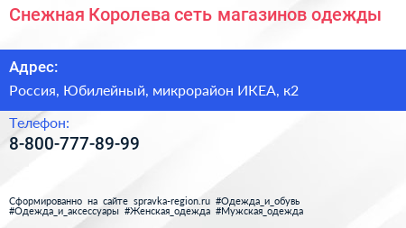 Снежная Королева, сеть магазинов одежды по адресу МЕГА Химки, 1, Ленинградское шоссе, Родионово, микрорайон ИКЕА, Химки, городской округ Химки, Московская область, Центральный федеральный округ, 141410, Россия в дальнейшем Организация, размещена в следующих категориях:
