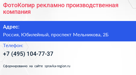 ФотоКопир, рекламно-производственная компания по адресу Пятёрочка, 2Б, проспект Мельникова, Родионово, Новокуркино, Новые Химки, Химки, городской округ Химки, Московская область, Центральный федеральный округ, 141410, Россия в дальнейшем Организация, размещена в следующих категориях: