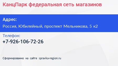 КанцПарк, федеральная сеть магазинов по адресу 5 к2, проспект Мельникова, Родионово, Новокуркино, Новые Химки, Химки, городской округ Химки, Московская область, Центральный федеральный округ, 141501, Россия в дальнейшем Организация, размещена в следующих категориях: