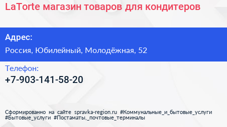 LaTorte, магазин товаров для кондитеров по адресу Ozon, 52, Молодёжная улица, Родионово, Новокуркино, Новые Химки, Химки, городской округ Химки, Московская область, Центральный федеральный округ, 141501, Россия в дальнейшем Организация, размещена в следующих категориях: