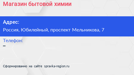 Магазин бытовой химии по адресу 7, проспект Мельникова, Родионово, Новокуркино, Новые Химки, Химки, городской округ Химки, Московская область, Центральный федеральный округ, 141501, Россия в дальнейшем Организация, размещена в следующих категориях: