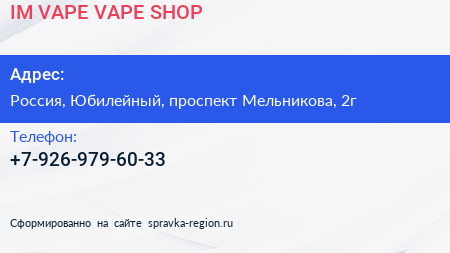 IM VAPE VAPE SHOP по адресу Народный кондитер, 2Г, проспект Мельникова, Родионово, Новокуркино, Новые Химки, Химки, городской округ Химки, Московская область, Центральный федеральный округ, 141410, Россия в дальнейшем Организация, размещена в следующих категориях: