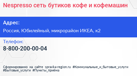 Nespresso, сеть бутиков кофе и кофемашин по адресу МЕГА Химки, 1, Ленинградское шоссе, Родионово, микрорайон ИКЕА, Химки, городской округ Химки, Московская область, Центральный федеральный округ, 141410, Россия в дальнейшем Организация, размещена в следующих категориях: