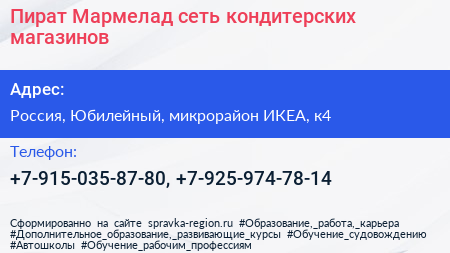 Пират-Мармелад, сеть кондитерских магазинов по адресу МЕГА Химки, 1, Ленинградское шоссе, Родионово, микрорайон ИКЕА, Химки, городской округ Химки, Московская область, Центральный федеральный округ, 141410, Россия в дальнейшем Организация, размещена в следующих категориях: