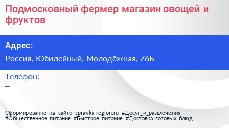 Подмосковный фермер, магазин овощей и фруктов по адресу Фермер, проспект Мельникова, Родионово, микрорайон ИКЕА, Планерная, Химки, городской округ Химки, Московская область, Центральный федеральный округ, 141410, Россия в дальнейшем Организация, размещена в следующих категориях: