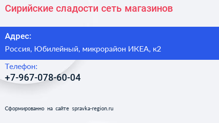 Сирийские сладости, сеть магазинов по адресу МЕГА Химки, 1, Ленинградское шоссе, Родионово, микрорайон ИКЕА, Химки, городской округ Химки, Московская область, Центральный федеральный округ, 141410, Россия в дальнейшем Организация, размещена в следующих категориях: