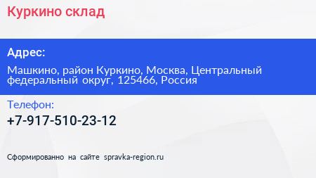 Куркино-склад по адресу Машкино, район Куркино, Москва, Центральный федеральный округ, 125466, Россия в дальнейшем Организация, размещена в следующих категориях: