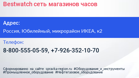 Bestwatch, сеть магазинов часов по адресу МЕГА Химки, 1, Ленинградское шоссе, Родионово, микрорайон ИКЕА, Химки, городской округ Химки, Московская область, Центральный федеральный округ, 141410, Россия в дальнейшем Организация, размещена в следующих категориях: