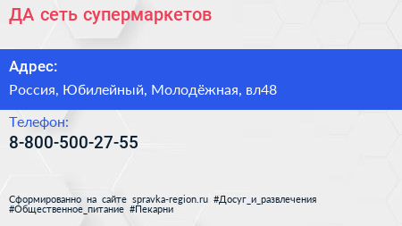 ДА!, сеть супермаркетов по адресу Да!, вл48, Молодёжная улица, Родионово, Новокуркино, Новые Химки, Химки, городской округ Химки, Московская область, Центральный федеральный округ, 119296, Россия в дальнейшем Организация, размещена в следующих категориях:
