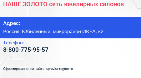 НАШЕ ЗОЛОТО, сеть ювелирных салонов по адресу МЕГА Химки, 1, Ленинградское шоссе, Родионово, микрорайон ИКЕА, Химки, городской округ Химки, Московская область, Центральный федеральный округ, 141410, Россия в дальнейшем Организация, размещена в следующих категориях: