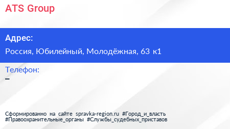 ATS Group по адресу 63 к1, Молодёжная улица, Родионово, Новокуркино, Новые Химки, Химки, городской округ Химки, Московская область, Центральный федеральный округ, 141501, Россия в дальнейшем Организация, размещена в следующих категориях: