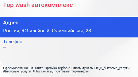 Top wash, автокомплекс по адресу Центр художественной гимнастики И.А. Винер-Усмановой, 15, Олимпийская улица, Жилой комплекс "Олимпийская деревня", Новогорск, Химки, городской округ Химки, Московская область, Центральный федеральный округ, 141435, Россия в дальнейшем Организация, размещена в следующих категориях: