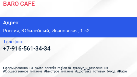 BARO CAFE по адресу Фасоль, 1 к2, Ивановская улица, Жилой комплекс «Новогорск Парк», Химки, городской округ Химки, Московская область, Центральный федеральный округ, 141435, Россия в дальнейшем Организация, размещена в следующих категориях: