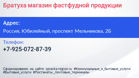 Братуха, магазин фастфудной продукции по адресу Альфа-Банк, 2Б, проспект Мельникова, Родионово, Новокуркино, Новые Химки, Химки, городской округ Химки, Московская область, Центральный федеральный округ, 141501, Россия в дальнейшем Организация, размещена в следующих категориях: