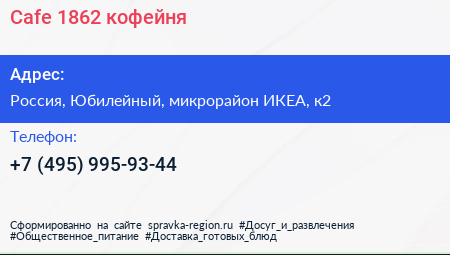 Cafe 1862, кофейня по адресу МЕГА Химки, 1, Ленинградское шоссе, Родионово, микрорайон ИКЕА, Химки, городской округ Химки, Московская область, Центральный федеральный округ, 141410, Россия в дальнейшем Организация, размещена в следующих категориях: