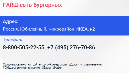 #FARШ, сеть бургерных по адресу МЕГА Химки, 1, Ленинградское шоссе, Родионово, микрорайон ИКЕА, Химки, городской округ Химки, Московская область, Центральный федеральный округ, 141410, Россия в дальнейшем Организация, размещена в следующих категориях: