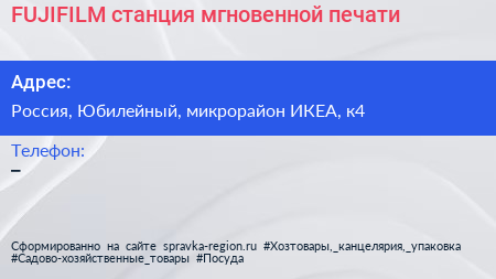 FUJIFILM, станция мгновенной печати по адресу Фотосфера, 1, Ленинградское шоссе, Родионово, микрорайон ИКЕА, Химки, городской округ Химки, Московская область, Центральный федеральный округ, 141410, Россия в дальнейшем Организация, размещена в следующих категориях: