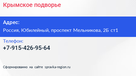 Крымское подворье по адресу Крымское подворье, проспект Мельникова, Родионово, Новокуркино, Новые Химки, Химки, городской округ Химки, Московская область, Центральный федеральный округ, 141410, Россия в дальнейшем Организация, размещена в следующих категориях:
