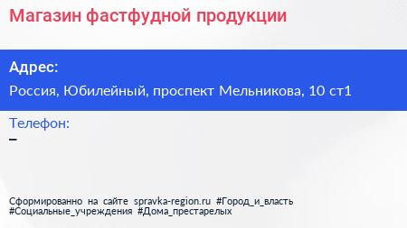 Магазин фастфудной продукции по адресу с2Г, проспект Мельникова, Родионово, Новокуркино, Новые Химки, Химки, городской округ Химки, Московская область, Центральный федеральный округ, 141501, Россия в дальнейшем Организация, размещена в следующих категориях: