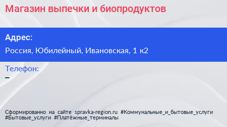 Магазин выпечки и биопродуктов по адресу Фасоль, 1 к2, Ивановская улица, Жилой комплекс «Новогорск Парк», Химки, городской округ Химки, Московская область, Центральный федеральный округ, 141435, Россия в дальнейшем Организация, размещена в следующих категориях: