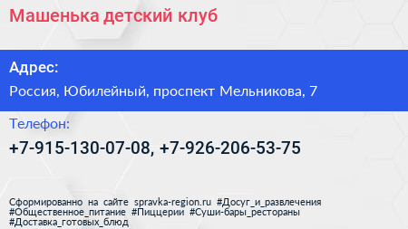 Машенька, детский клуб по адресу 7, проспект Мельникова, Родионово, Новокуркино, Новые Химки, Химки, городской округ Химки, Московская область, Центральный федеральный округ, 141501, Россия в дальнейшем Организация, размещена в следующих категориях: