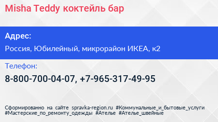 Misha & Teddy, коктейль-бар по адресу МЕГА Химки, 1, Ленинградское шоссе, Родионово, микрорайон ИКЕА, Химки, городской округ Химки, Московская область, Центральный федеральный округ, 141410, Россия в дальнейшем Организация, размещена в следующих категориях: