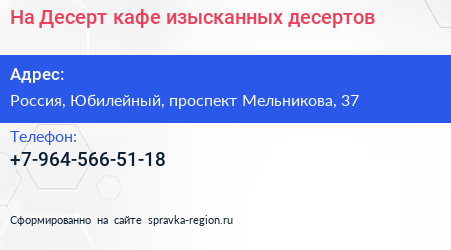 На Десерт, кафе изысканных десертов по адресу 37, проспект Мельникова, Родионово, микрорайон ИКЕА, Планерная, Химки, городской округ Химки, Московская область, Центральный федеральный округ, 141501, Россия в дальнейшем Организация, размещена в следующих категориях:
