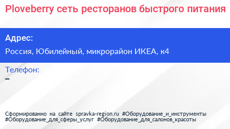 Ploveberry, сеть ресторанов быстрого питания по адресу МЕГА Химки, 1, Ленинградское шоссе, Родионово, микрорайон ИКЕА, Химки, городской округ Химки, Московская область, Центральный федеральный округ, 141410, Россия в дальнейшем Организация, размещена в следующих категориях: