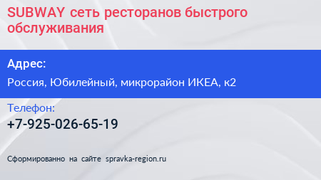 SUBWAY, сеть ресторанов быстрого обслуживания по адресу МЕГА Химки, 1, Ленинградское шоссе, Родионово, микрорайон ИКЕА, Химки, городской округ Химки, Московская область, Центральный федеральный округ, 141410, Россия в дальнейшем Организация, размещена в следующих категориях: