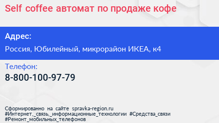 Self.coffee, автомат по продаже кофе по адресу МЕГА Химки, 1, Ленинградское шоссе, Родионово, микрорайон ИКЕА, Химки, городской округ Химки, Московская область, Центральный федеральный округ, 141410, Россия в дальнейшем Организация, размещена в следующих категориях: