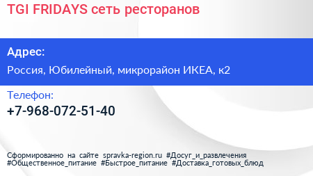 TGI FRIDAYS, сеть ресторанов по адресу МЕГА Химки, 1, Ленинградское шоссе, Родионово, микрорайон ИКЕА, Химки, городской округ Химки, Московская область, Центральный федеральный округ, 141410, Россия в дальнейшем Организация, размещена в следующих категориях: