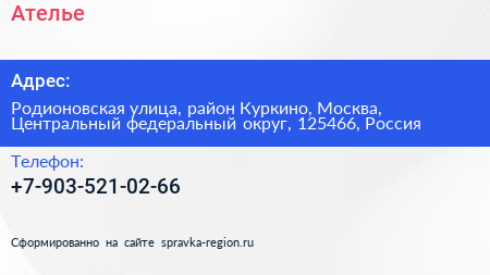 Ателье по адресу Родионовская улица, район Куркино, Москва, Центральный федеральный округ, 125466, Россия в дальнейшем Организация, размещена в следующих категориях: