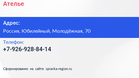 Для связи с организацией воспользуйтесь номером телефона: +7-926-928-84-14. Пн: выходной, Вт: c 10:00-20:00, Ср: c 10:00-20:00, Чт: c 10:00-20:00, Пт: c 10:00-20:00, Сб: c 10:00-20:00, Вс: c 10:00-20:00, вы можете обратиться в эту организацию.