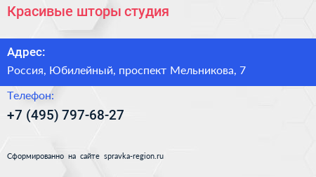 Красивые шторы, студия по адресу 7, проспект Мельникова, Родионово, Новокуркино, Новые Химки, Химки, городской округ Химки, Московская область, Центральный федеральный округ, 141501, Россия в дальнейшем Организация, размещена в следующих категориях: