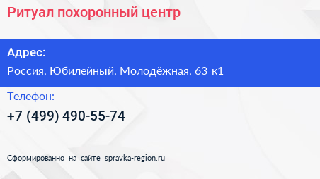 Ритуал, похоронный центр по адресу 63 к1, Молодёжная улица, Родионово, Новокуркино, Новые Химки, Химки, городской округ Химки, Московская область, Центральный федеральный округ, 141501, Россия в дальнейшем Организация, размещена в следующих категориях: