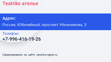 Teatriks, ателье по адресу 3, проспект Мельникова, Родионово, Новокуркино, Новые Химки, Химки, городской округ Химки, Московская область, Центральный федеральный округ, 141501, Россия в дальнейшем Организация, размещена в следующих категориях: