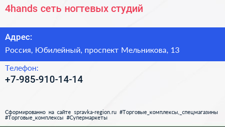 4hands, сеть ногтевых студий по адресу 13, проспект Мельникова, Родионово, Новокуркино, Новые Химки, Химки, городской округ Химки, Московская область, Центральный федеральный округ, 141501, Россия в дальнейшем Организация, размещена в следующих категориях:
