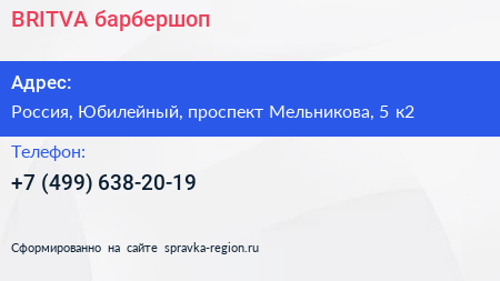 BRITVA, барбершоп по адресу 5 к2, проспект Мельникова, Родионово, Новокуркино, Новые Химки, Химки, городской округ Химки, Московская область, Центральный федеральный округ, 141501, Россия в дальнейшем Организация, размещена в следующих категориях:
